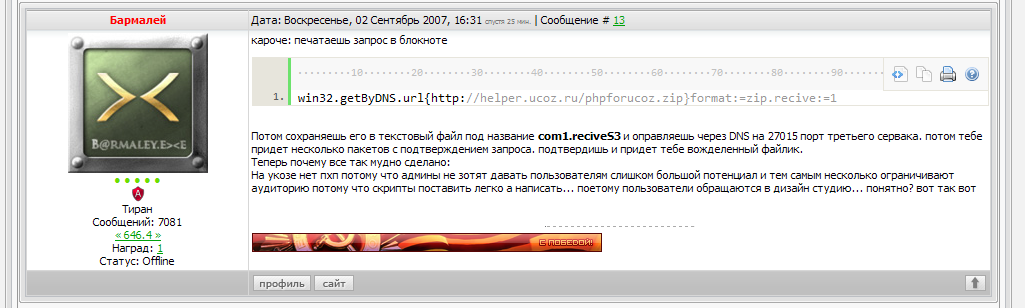 | Панда, пробовал ставить с юкоз хелпера?? Там обновили его. И у меня проблемы со скачкой этого файла, это архив который ни одной прогой не распаковывается но там сказали есть способ как то через DNS сервера скачать файл в расширении ZIP (который распаковать можно). Если не скачивал то попробуй это сделать плз и дай файл мне. Я не умею отправлять текстовые запросы на порты через DNS чтобы получить файл со всеми скриптами. Если получится то поставлю скрипты и бота для сайт мапы. Она очень нужна. Если получится то поучу PHP и поставлю несколько стабильных скриптов. Ну так что? Скрин поста с хелпера читай: